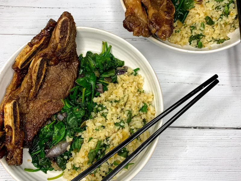 Once the ribs are done, plate the spinach and cauliflower rice mixture, top with ribs, and serve.