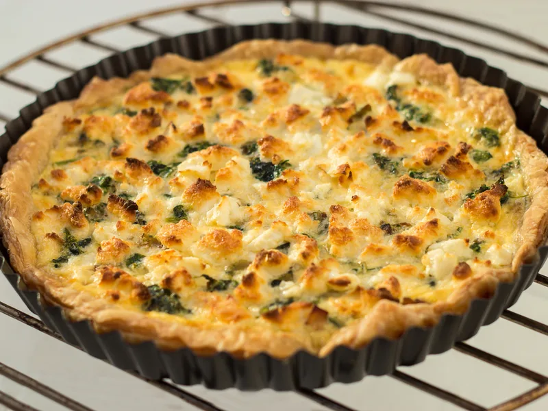 Portuguese-style vegan tart with a blended flour and soy milk crust, layered with cooked chickpeas, fresh spinach, caramelized onions in soy sauce, and tomato. Baked until golden and firm inside. Serve warm or cold.