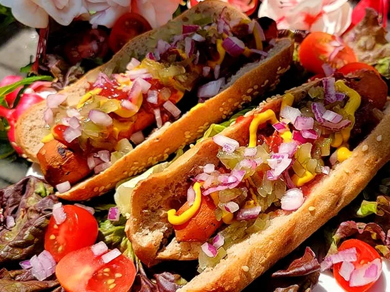 Plant-based hot dogs made from whole carrots marinated in a savory blend of balsamic vinegar, tamari, molasses, and warm spices like smoked paprika and cumin. Grilled until fork-tender with char marks, then served in whole wheat buns with fresh red onion, mustard, ketchup, and relish.