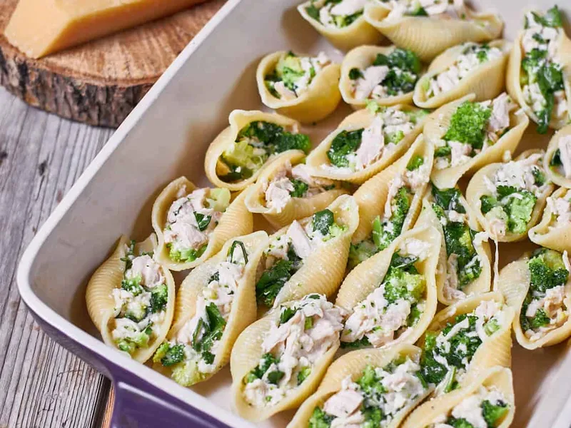 Creamy pasta shells filled with tender shredded chicken, ricotta, and fresh broccoli in rich alfredo sauce. The air fryer creates perfectly melted cheese without heating up your kitchen. Perfect for busy weeknight dinners or meal prep when you want comfort food fast. This recipe transforms leftover chicken into an indulgent family meal that's ready in under 15 minutes once assembled.
