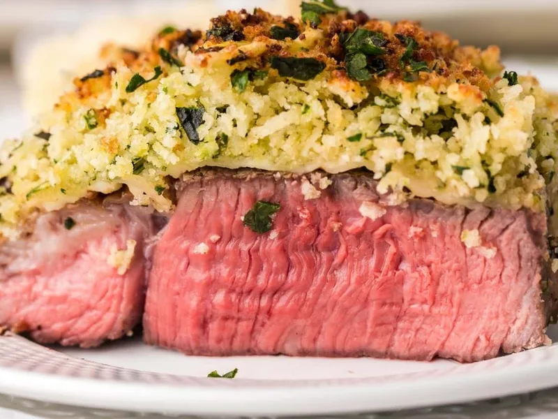 Juicy sirloin steaks seared in an air fryer and topped with a buttery, garlicky panko-parmesan crust studded with ranch seasoning and creamy provolone. The crispy breadcrumb topping contrasts the tender medium-rare beef, while fresh parsley and minced garlic add brightness. Perfect for weeknight dinners or when you want steakhouse quality without the kitchen heat. This version skips the traditional breading process entirely, building maximum crust in the air fryer's convection environment.