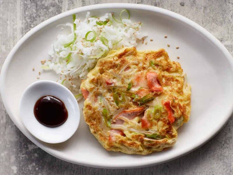Crispy-edged Chinese egg patties loaded with cooked salmon, bean sprouts, and green onions. Bound with cornstarch slurry and pan-fried in grapeseed and sesame oil until golden. Serve with warm oyster sauce or foo yung sauce for dipping.