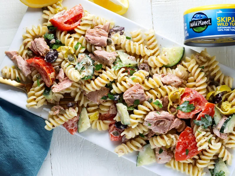 Chilled fusilli salad combining canned tuna, roma tomatoes, kalamata olives, pepperoncini peppers, capers, and fresh parsley bound with a mayonnaise-dijon dressing. Serve cold as a light lunch or side dish.