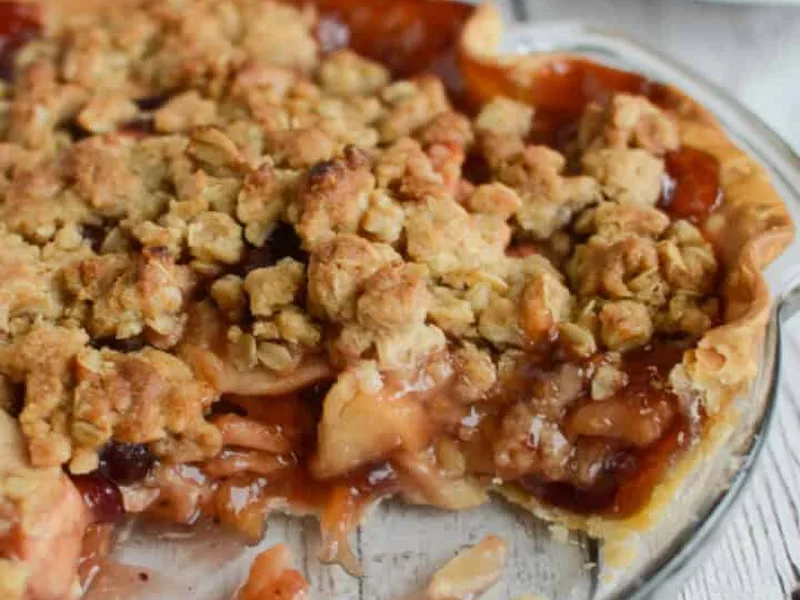 A homestyle apple pie layered with tart cranberry sauce and topped with a buttery oat streusel. Granny Smith apples combine with whole berry cranberry sauce and cornstarch for a jammy filling that bakes beneath a cinnamon-spiced flour and oat crumble. Baked in a refrigerated pie crust until the apples soften, this dessert pairs perfectly with whipped cream or vanilla ice cream.