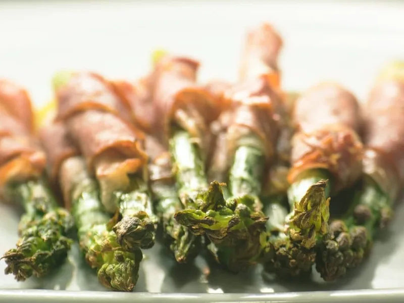 A simple yet elegant appetizer or side dish featuring tender asparagus spears bundled in thin slices of salted ham, then roasted until the ham crisps at the edges. This version uses steam rather than boiling to preserve the asparagus's delicate texture and bright green color, then finishes in the oven where gentle heat allows the ham to brown without drying out the vegetable inside. The combination delivers savory, salty ham against sweet, grassy asparagus with a slight textural contrast—tender vegetable, crispy ham edges. It's ideal for home cooks seeking an impressive side dish that requires minimal effort and pantry staples. Serve hot as a dinner side or cool as an appetizer. What sets this approach apart is the steam-blanch method, which maintains better color and texture than boiling, while the short oven finish ensures the ham develops flavor without overcooking the asparagus.