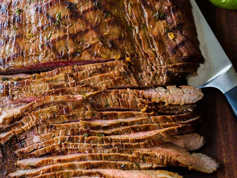 Slice against the grain using a sharp knife at a slight angle. This breaks muscle fibers across their length, maximizing tenderness and preventing chewy bites even with a lean cut like flank steak.