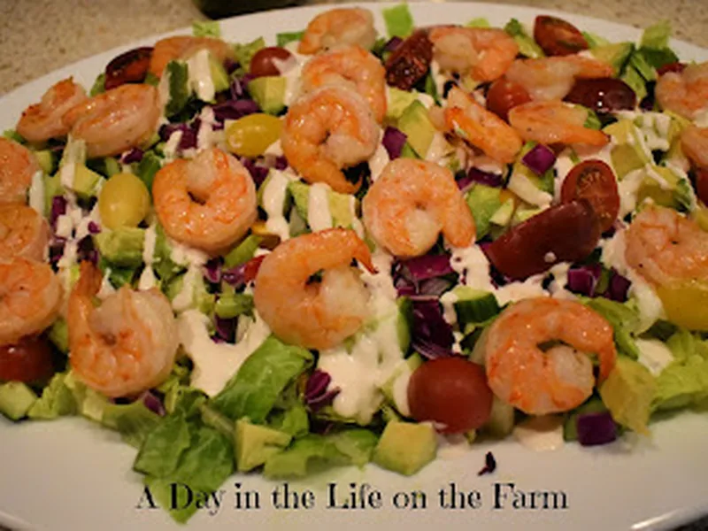 Fresh chopped salad with grilled shrimp, ripe avocado, crisp romaine, red cabbage, bell pepper, and fennel, tossed with buttermilk ranch dressing. Quick weeknight dinner combining seasoned shrimp grilled in a basket until pink with vibrant vegetables for a light, protein-rich meal.
