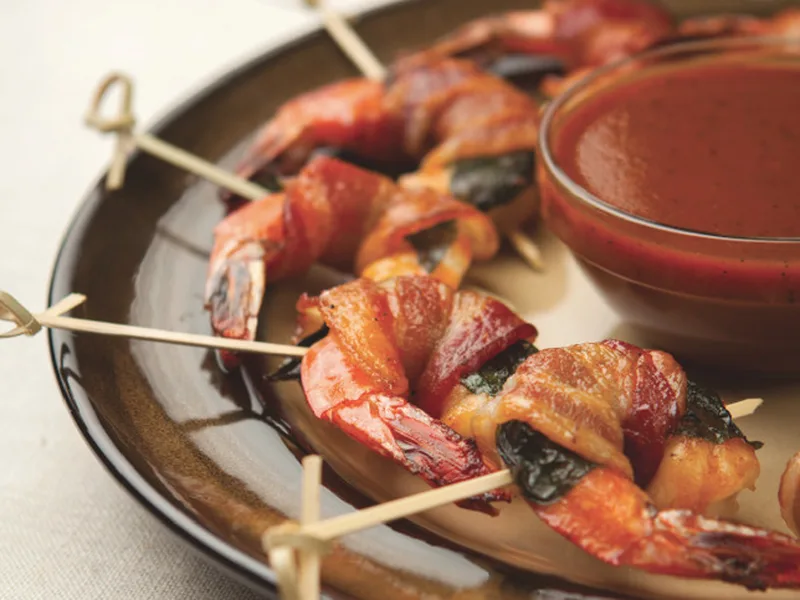 Extra large shrimp wrapped in basil and bacon, then baked and broiled until the bacon crisps. A tangy barbecue sauce mixed with prepared horseradish is brushed on during the final broil stage, creating a caramelized coating. Ready in under 15 minutes.