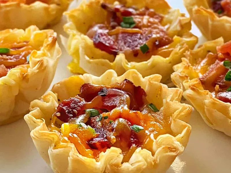 Individual quiches baked in crispy phyllo shells with bacon, cheddar cheese, and a custard filling of eggs and milk. Quick weeknight appetizer or brunch item that comes together in under 20 minutes. Phyllo cups eliminate crust prep work while delivering a light, flaky texture.