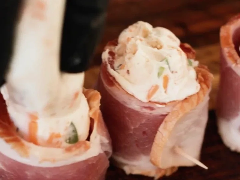 Pipe filling using a pastry bag for restaurant-quality presentation and even distribution. This ensures every bite has balanced cheese, jalapeno, and spice throughout.