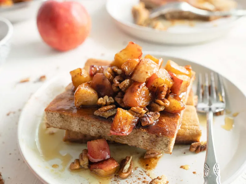 Sheet pan pancakes made with almond flour, applesauce, and eggs, baked until golden and topped with sauteed cinnamon apples, pecans, and maple syrup. A grain-free, protein-rich breakfast that serves six with minimal stovetop time.