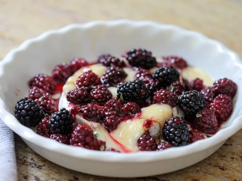 Creamy baked wheel of Brie topped with warm blackberries macerated in honey and fresh thyme. The cheese becomes melting and luxurious while the fruit softens into a jammy topping. Served immediately with crackers for a simple yet elegant appetizer or dessert.