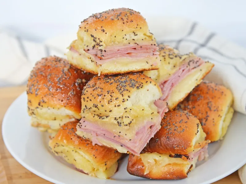 Warm, cheesy sliders featuring layers of honey ham and Swiss cheese nestled in soft Hawaiian rolls, topped with a savory butter glaze infused with Dijon mustard and poppy seeds. Perfect for game day gatherings, potluck dinners, or casual family meals. The combination of sweet rolls with tangy mustard glaze and melted cheese creates an irresistible crowd-pleasing appetizer that disappears quickly.