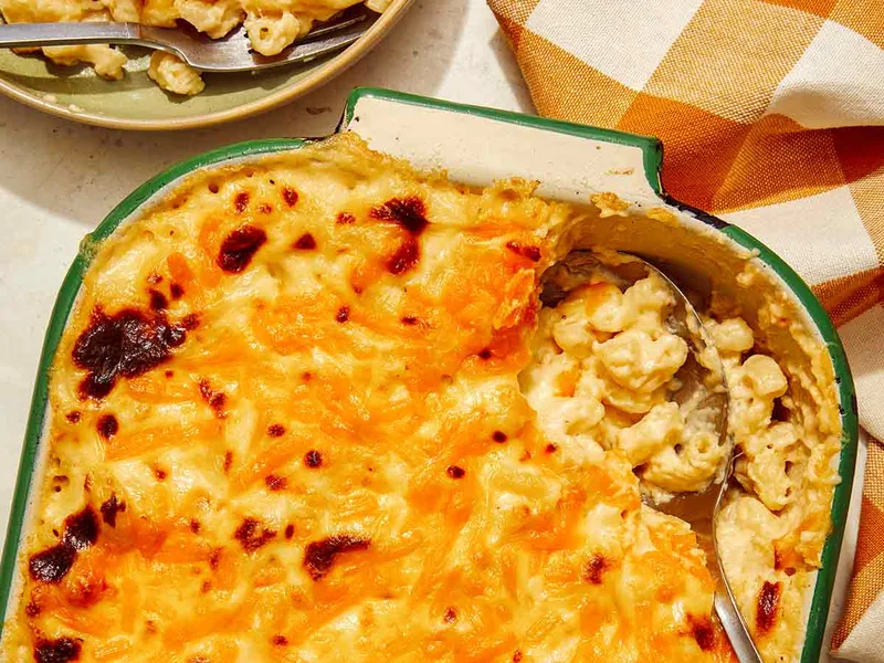 This classic baked macaroni and cheese combines creamy cheddar and nutty gruyere in a rich cheese sauce that's baked until golden and bubbling. The two-cheese blend creates incredible depth of flavor, while the roux-based sauce ensures a silky smooth texture that clings perfectly to every piece of pasta. Perfect for family dinners, potlucks, or whenever you're craving ultimate comfort food. The brief broiling step at the end creates an irresistible golden-brown top that contrasts beautifully with the creamy interior.