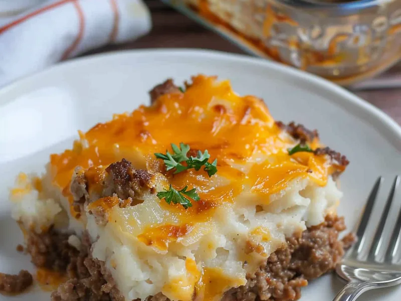 A hearty comfort food casserole that layers seasoned ground beef with creamy mashed potatoes, melted cheddar cheese, and crispy bacon bits. This satisfying dish combines classic meatloaf flavors with the convenience of a one-pan meal, making it perfect for busy weeknight dinners or family gatherings. The garlic-flavored instant potatoes create a fluffy topping that browns beautifully in the oven, while the Italian breadcrumbs keep the meat layer tender and flavorful.