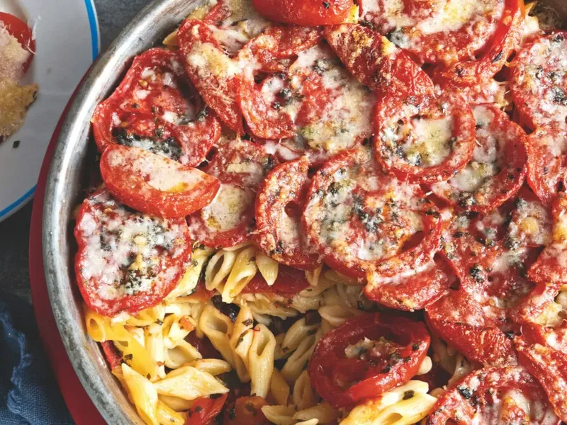 Salt the sliced tomatoes before layering; they release liquid that steams the pasta from within. This is the dish's defining technique—don't skip it.