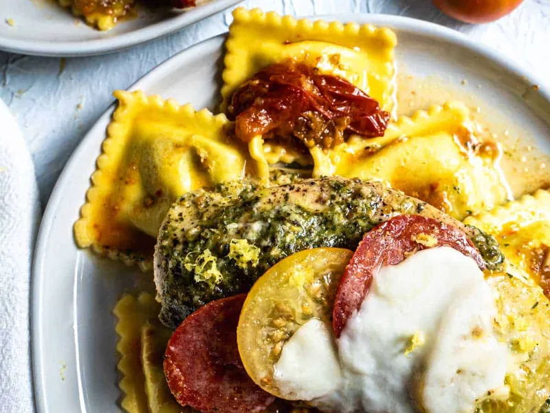 Boneless skinless chicken breast split and baked en papillote with pesto, fresh mozzarella, Parmesan, and tomato. The parchment steams the chicken while trapping moisture, yielding tender meat infused with basil and cheese flavors. Ready in 15-20 minutes at 400°F.