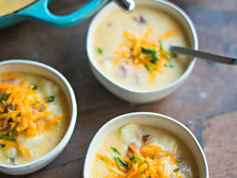A hearty, creamy soup that transforms classic loaded baked potato flavors into a warming bowl. Sharp cheddar cheese melts into a smooth milk base while chunks of tender baked potatoes provide satisfying texture. Diced ham adds protein and smoky flavor, while sour cream creates richness and tangy depth. Fresh green onions provide a bright finish that balances the rich, cheesy base. Perfect for cold weather comfort food or using up leftover baked potatoes and ham.