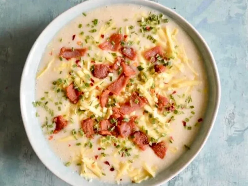 Serve hot in bowls, topped with chives, dairy-free cheese and bacon while hot.