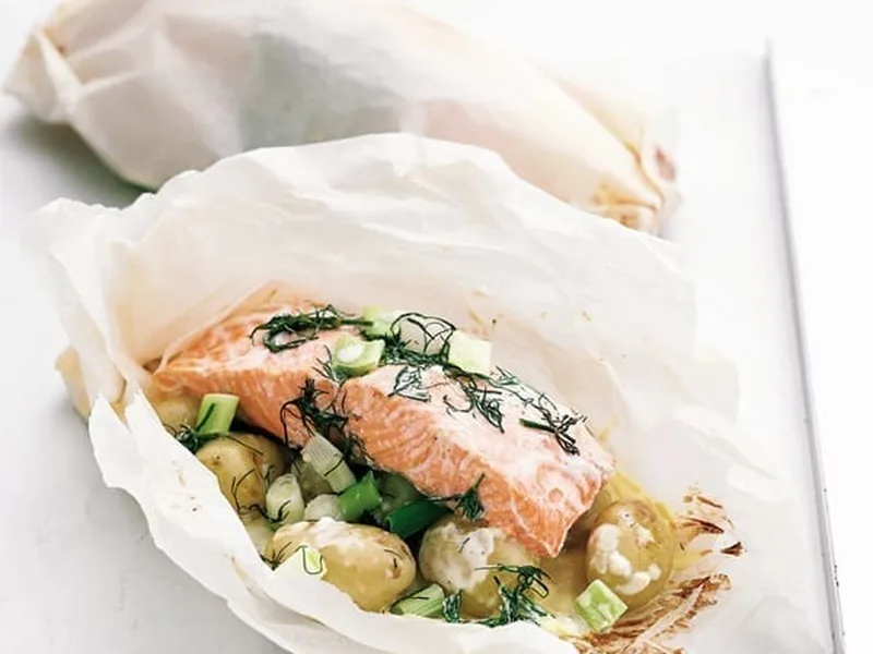 Elegant en papillote salmon fillets paired with Jersey Royal potatoes and a silky dill-cream sauce, all steamed in sealed paper or foil parcels. This restaurant-quality dish delivers moist, delicate salmon and tender potatoes infused with fresh herbs and rich cream, creating individual flavor packets that open dramatically at the table. The cooking method locks in moisture and aromatics, ensuring perfectly cooked fish every time. Ideal for dinner parties or special occasions when you want impressive plating without fusswork. Spring onions and fresh dill brighten the cream sauce, while the waxy texture of Jersey Royals holds up beautifully to steaming. Perfect for entertaining because prep happens ahead and baking requires minimal attention. The parcels can be assembled hours in advance, making this a stress-free elegant meal that feels far more labor-intensive than it actually is. Serve with steamed seasonal greens for a balanced, restaurant-worthy plate.