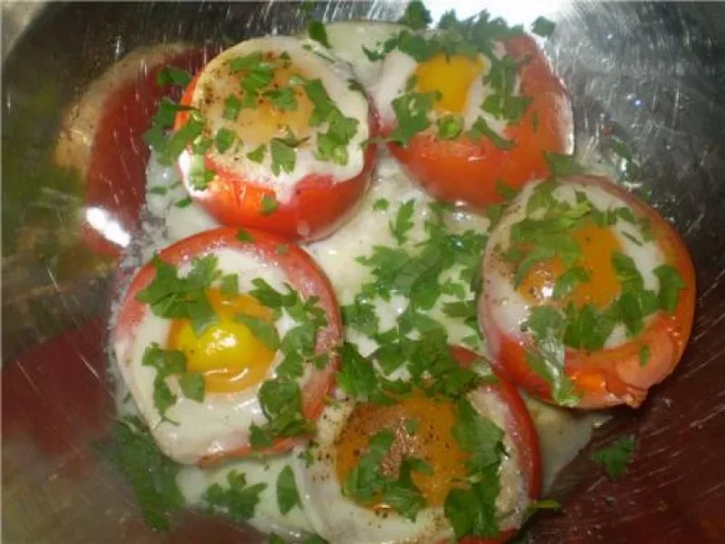Tomato kegs with eggs is a warm, visually striking appetizer where hollowed tomatoes become edible vessels for baked eggs. The dish combines tender, slightly collapsed tomato shells with soft-cooked eggs, finished with a bright umami-rich sauce made from the scooped tomato insides blended with vegetable oil and soy sauce. Fresh parsley and dill add herbaceous notes that cut through the richness. This recipe appeals to home cooks seeking elegant yet simple starters that feel special without complex technique. Serve warm as an opener to a multi-course meal or as part of a brunch spread. What sets this version apart is the dual use of tomatoes—both as a cooking vessel and sauce base—creating cohesive flavor and dramatic plating that impresses without fussy presentation.