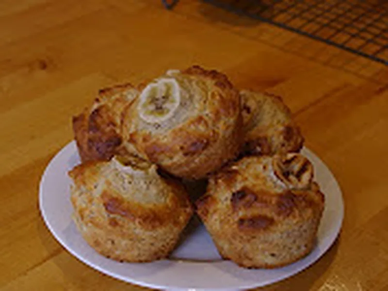 Wholesome banana and rolled oat muffins combining white and wholemeal self-raising flours with natural yogurt and sunflower oil. Topped with fresh banana slices before baking. These muffins deliver a tender crumb with nutty oat texture and natural sweetness from mashed banana and brown sugar, requiring no refined sweeteners beyond rice malt syrup.