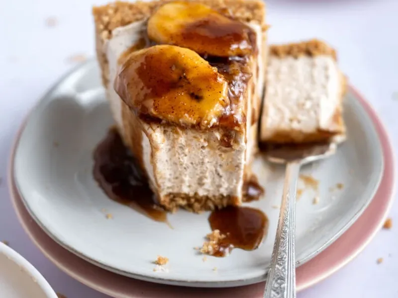 A creamy no-bake cheesecake featuring a graham cracker crust, brown sugar cinnamon filling made with whipped cream, and a warm bananas foster topping with butter, brown sugar, cinnamon, and rum extract. Requires eight hours of chilling.
