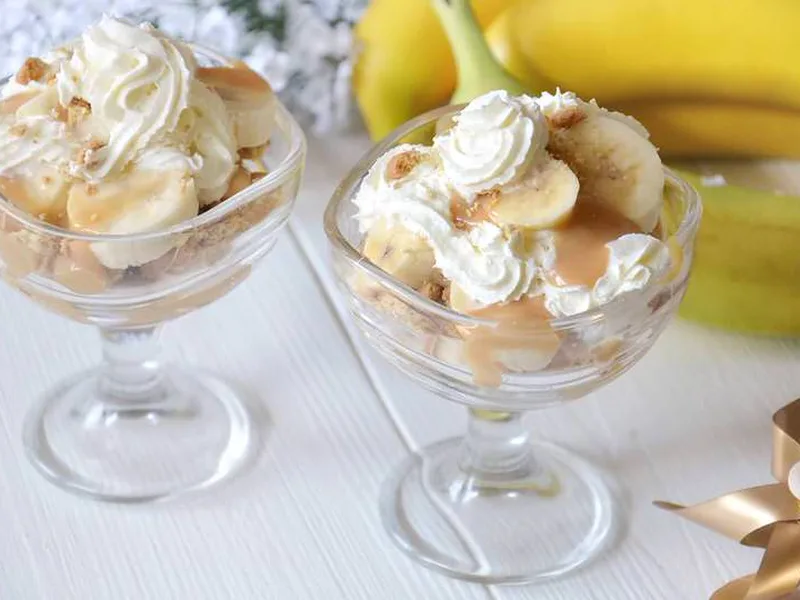 Layered dessert cup combining crushed digestive biscuits, sliced banana, toffee sauce, and whipped cream. If making toffee sauce from scratch, boil condensed milk in water for two and a half hours, then cool before opening to create dulce de leche. Assemble in glasses with alternating layers, finishing with whipped cream and biscuit crumbs.