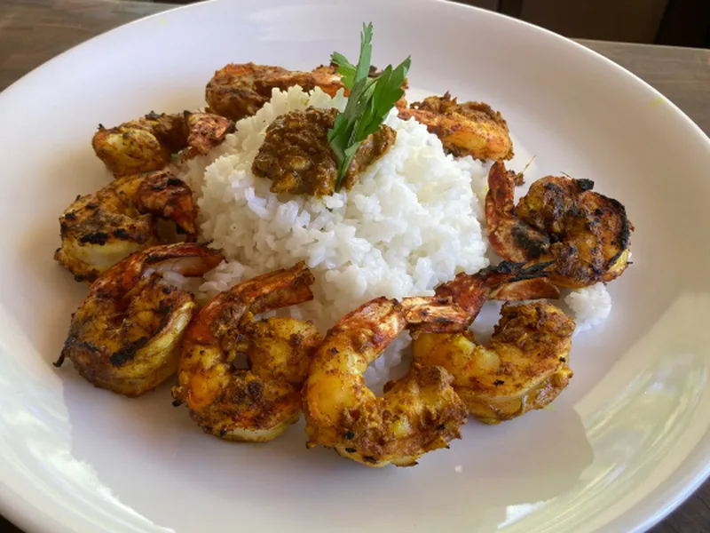 Succulent grilled shrimp coated in a fragrant spice paste of ginger, garlic, cinnamon, cumin, and turmeric, finished with fresh lime and cilantro. Served over steamed white rice with an extra dollop of the aromatic paste. Quick-cooking and full of warm spice complexity.