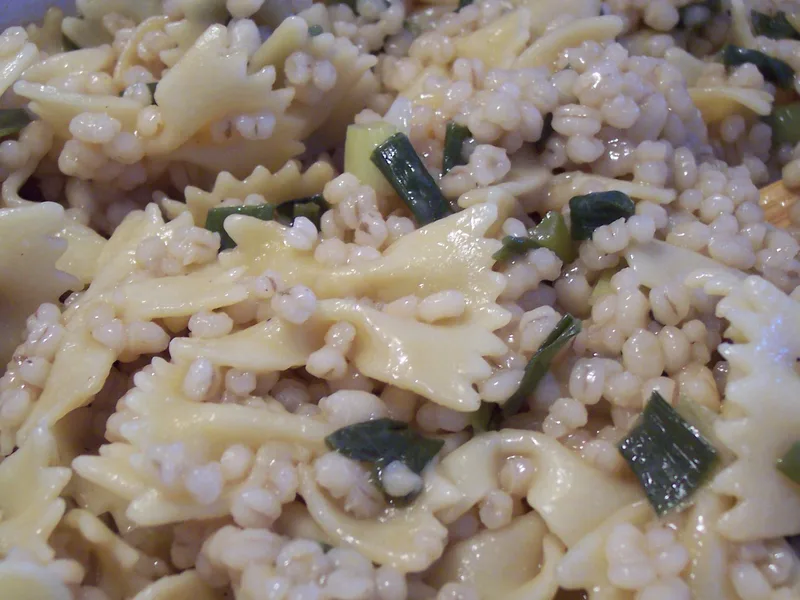 A one-dish baked pilaf combining nutty pearl barley with bow tie pasta, sauteed in butter and simmered in chicken or vegetable broth with fresh green onions. The barley toasts lightly before absorbing liquid, creating tender grains with distinct texture against soft pasta. Serve as a warming side dish for roasted meats or vegetables, or as a vegetarian main with a salad. This oven method eliminates constant stirring while building flavor through initial toasting.