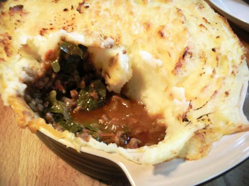 A hearty, one-dish comfort meal combining seasoned ground beef with tender cabbage, tomatoes, and red wine in a savory sauce, topped with creamy mashed potato and melted cheddar cheese. This British-inspired pie is special because it delivers complete nutrition in one baking dish—protein, vegetables, starch, and dairy all together. The beef develops deep umami flavors from Worcestershire and Tabasco, while the cabbage softens into the rich, slightly wine-forward gravy. The mashed potato topping becomes golden and crispy under high heat, contrasting beautifully with the moist filling below. Ideal for weeknight family dinners, casual entertaining, or when you want substantial comfort food without multiple components. This version stands apart by building flavor through slow simmering rather than browning, keeping the onions soft rather than caramelized, and using wine to add complexity. Perfect for autumn and winter meals when warming, filling dishes are most welcome.