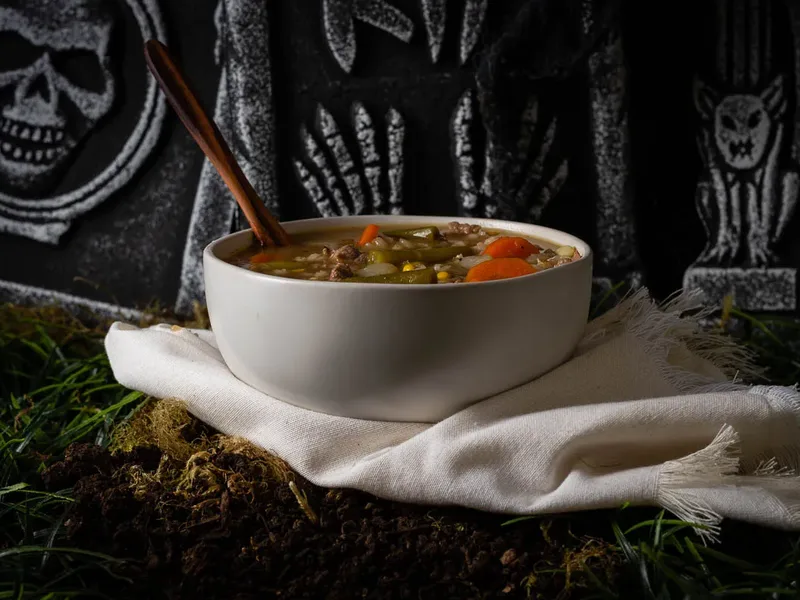 Cemetery Soup is a hearty beef and barley soup inspired by classic horror storytelling, packed with tender stew beef, root vegetables, and fresh produce in a rich bone broth base. This rustic one-pot meal delivers deep savory flavors from the beef, earthiness from barley and potatoes, and bright notes from thyme and fresh vegetables. The combination of soft carrots, green beans, corn, and tender potatoes creates varied textures that keep each spoonful interesting. Perfect for home cooks seeking comfort food that's both nourishing and satisfying, this soup works year-round but especially shines on cool evenings. Serve it as a complete meal or starter course. What sets this version apart is the use of bone broth for collagen and depth, the inclusion of fresh corn alongside traditional root vegetables, and the presence of barley for body and nutrition. The relatively quick cooking time—45 minutes total—makes it accessible for weeknight dinners while maintaining rich flavor development.