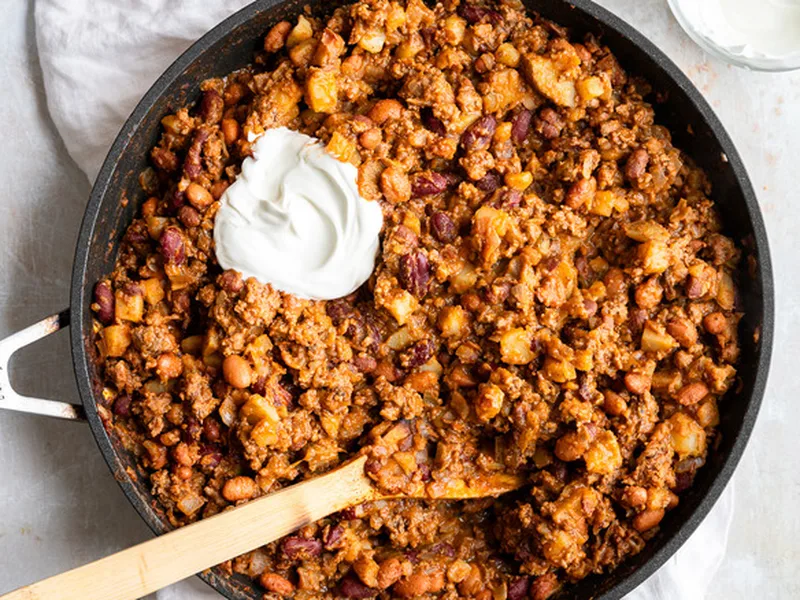 Hearty beef chili hash combines diced potatoes, seasoned ground beef, and a blend of pinto and kidney beans in a quick one-skillet meal. The chili starter provides savory spice and depth without requiring individual seasoning. Tender potatoes and soft beans create textural contrast against the browned beef, while sour cream cools and balances the dish's warmth. This recipe suits weeknight dinners, meal prep, and casual family gatherings—no special cooking skills required. Serve it as a standalone entrée or over rice for added substance. This version streamlines traditional chili by using canned beans and commercial chili starter, reducing active cooking time while maintaining robust flavor. The result is comfort food that's ready in under 45 minutes.
