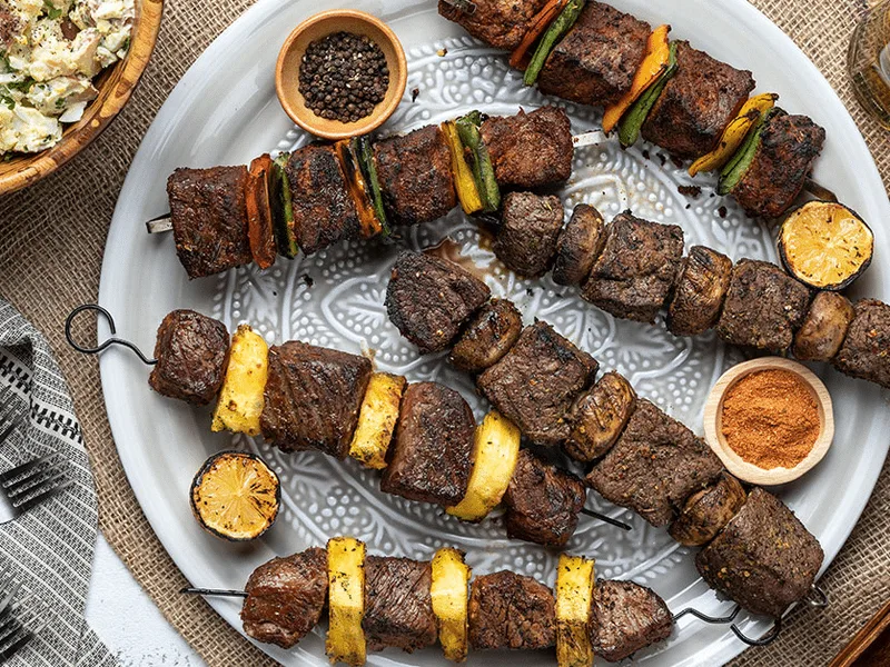 All three marinades and spice rub can be prepared one day ahead. Marinate steak cubes in refrigerator up to overnight for deeper flavor, though recipe specifies 4 hours minimum.
