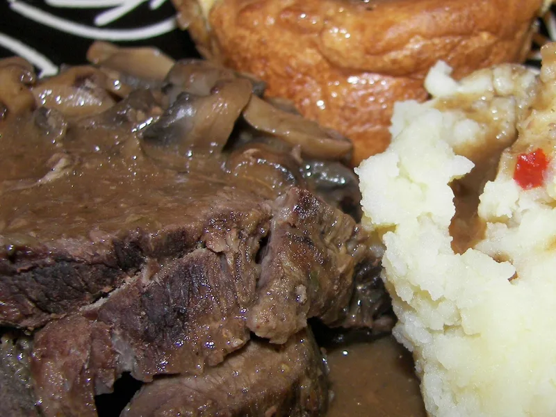 Slice roast and arrange on a warm platter, top with mushroom gravy. Serve with mashed potatoes, egg noodles, or roasted root vegetables.