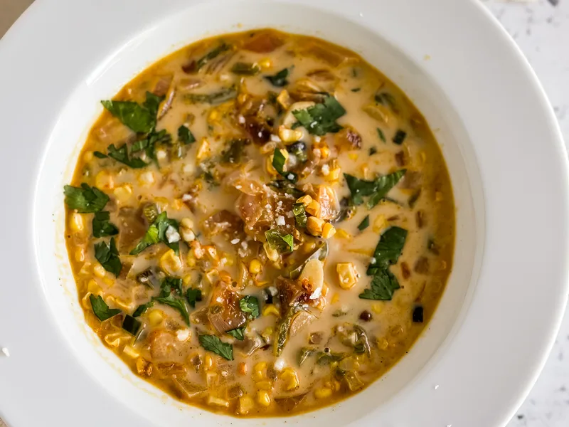 Charred corn kernels and roasted poblano peppers create deep flavor in this creamy Mexican-inspired soup. Corn cobs simmer into a rich, homemade broth that anchors the dish. Finished with heavy cream and crumbled cotija cheese, it's bright, smoky, and satisfying.