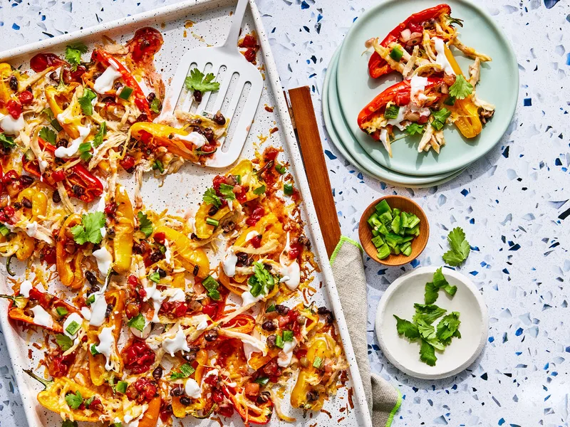 Crispy roasted mini bell pepper halves topped with seasoned shredded chicken, black beans, melted cheese, and fresh toppings. This lighter nacho variation swaps traditional tortilla chips for vegetable vessels, delivering all the flavors of loaded nachos with added nutrition. Perfect for meal prep, appetizers, or a protein-packed snack that feels indulgent but keeps calories in check. The roasting process caramelizes peppers while the foil-packet chicken method keeps meat moist and tender.
