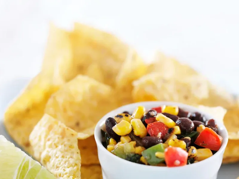 Fresh black bean and corn dip with diced tomato, cilantro, and lime juice. A simple no-cook appetizer combining canned beans and corn with fresh vegetables and grill seasoning. Chill before serving with tortilla chips.