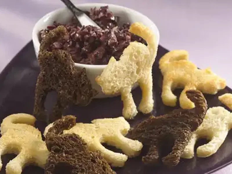 Whimsical Halloween appetizers featuring cat-shaped toasted bread rounds paired with a savory Mediterranean tapenade. The rich, briny kalamata olives combined with garlic and lemon create an elegant spread that contrasts beautifully with crispy golden bread. Perfect for Halloween parties, autumn gatherings, or any occasion where you want to add playful charm to your appetizer spread. The cat shapes make these especially delightful for children while the sophisticated olive tapenade appeals to adult palates.