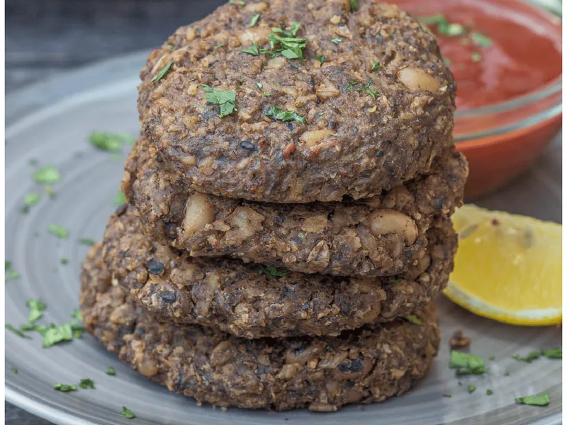 Plant-based burger patties combining black eyed peas, mushrooms, sweet potato, and oats with tamarind paste and almond butter for depth. Sauteed aromatics are processed with half the legumes until chunky, then combined with whole peas, oats, and grated sweet potato for texture. Patties are chilled, then baked until golden.