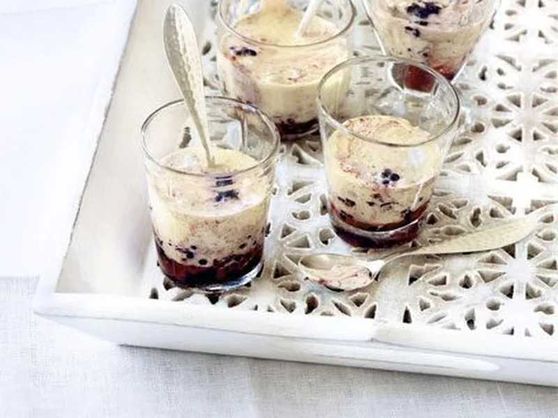 Spoon a portion of the crushed berry mixture into the bottom of 6 small glasses and set the rest aside.