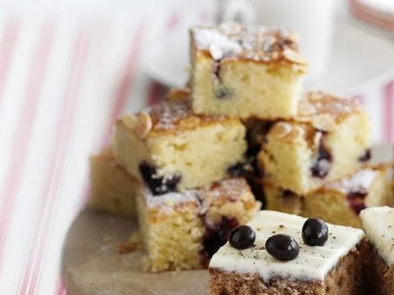Soft, buttery sponge cake studded with blackcurrant jam and toasted almonds. This one-tin traybake combines the flavors of a classic Bakewell tart with an easy all-in-one method. Golden and risen, best served warm or at room temperature with a dusting of icing sugar.