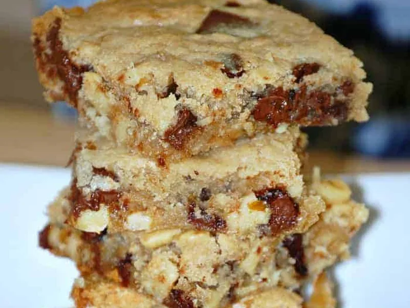 Dense, buttery blondies studded with semisweet chocolate chips and walnuts. Brown sugar creates a rich, caramel-like flavor while careful mixing keeps the texture tender. Baked in an 8-inch square pan until the top turns golden brown, these bars deliver chocolate and walnut pieces in every bite.