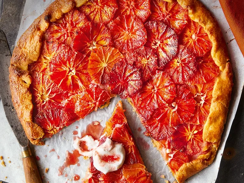 A stunning free-form galette showcasing jewel-toned blood oranges with cardamom-spiced whipped cream. This rustic tart combines buttery, hazelnut-enriched pastry with tart-sweet citrus and warm spice, creating layers of complexity in every bite. The blood oranges provide both the filling and a glossy syrup that bridges fruit and cream. Best made when blood oranges peak in winter, this showstopper suits elegant dinners or afternoon gatherings where pastry skill matters less than bold flavors. The cardamom distinguishes this version from standard citrus tarts, adding an unexpected floral note that enhances simple ingredients. Soft peaks of cardamom cream alongside syrupy oranges and crisp-chewy pastry edges deliver texture and richness without heaviness. Ideal for cooks seeking restaurant-quality results with accessible technique.