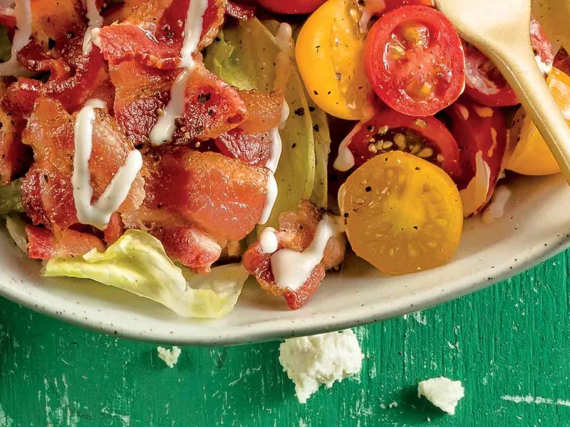 A fresh take on the classic BLT sandwich transformed into a hearty pasta salad. Crispy bacon, cool iceberg lettuce, and sweet grape tomatoes combine with tender bow tie pasta, tangy feta, and creamy ranch dressing for a dish that works equally well at picnics, potlucks, or quick weeknight dinners. The red onion adds sharp bite while feta brings salty richness. Unlike warm pasta dishes, this salad stays light and refreshing, with contrasting textures from crunchy lettuce and vegetables against soft pasta. The bacon-ranch combination delivers familiar comfort flavors in an unexpected format. Make this when you want something substantial yet cool, or serve it alongside grilled proteins for summer meals. It's ideal for those seeking a vegetable-forward salad with enough heartiness to stand alone.
