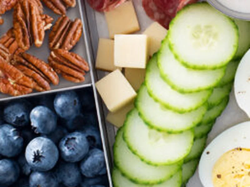 Divide blueberries, pecan halves, hard-boiled egg, cucumber slices, cheese, and salami among compartments of a lunch box.