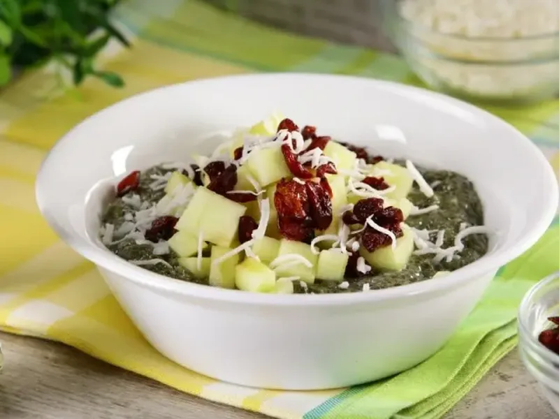 Top with diced apple, blueberries, and shredded coconut