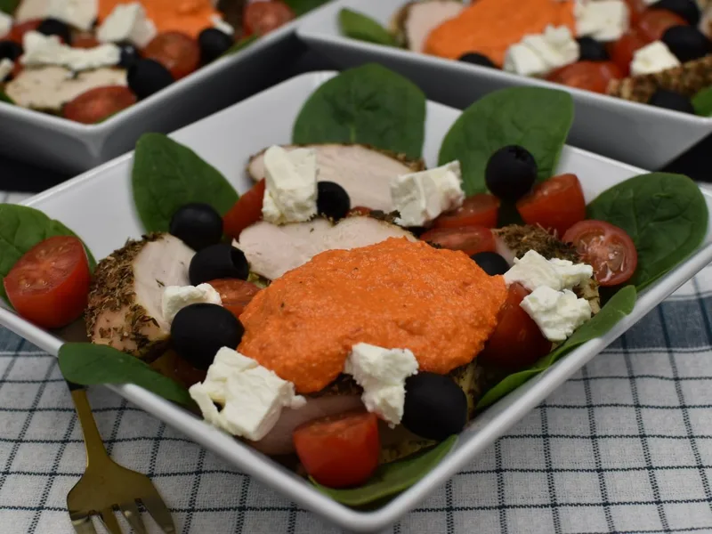 Mediterranean-inspired grain bowl featuring roasted chicken breast, fluffy couscous, and crisp vegetables topped with a creamy paprika-almond dip. Feta cheese, cherry tomatoes, black olives, and fresh spinach create a balanced, colorful meal with warm spices and bright citrus notes.