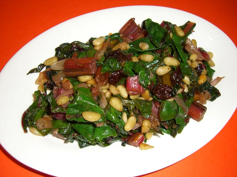 A simple Sicilian-inspired side dish where tender Swiss chard wilts with sweet raisins, toasted pine nuts, and a hint of balsamic vinegar. The combination of soft caramelized onions, nutty pine nuts, and juicy raisins creates layers of flavor that work beautifully alongside roasted meats or grains. Serve warm as a vegetable course or light lunch. This version emphasizes the contrast between the bitter greens and sweet-salty elements, with the final vinegar drizzle providing brightness and complexity.