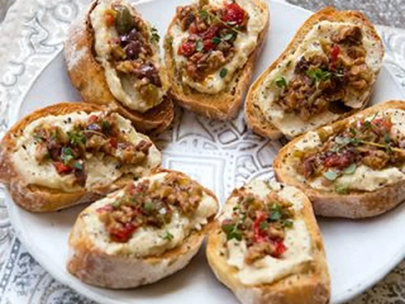 Crispy grilled baguette slices topped with smooth white bean puree blended with garlic, lemon, and thyme, finished with a briny olive-garlic mixture. Drizzled with extra virgin olive oil and garnished with fresh thyme and cracked black pepper for a simple, elegant appetizer.